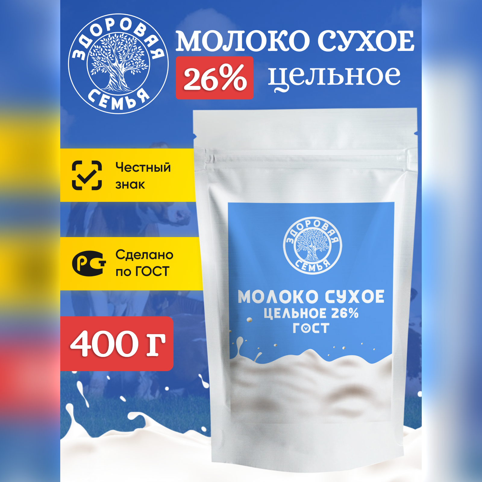 Купить Молоко сухое Здоровая Семья цельное 26% ГОСТ, 400 г, натуральное, заменитель молока для чая, кофе и выпечки, без сахара