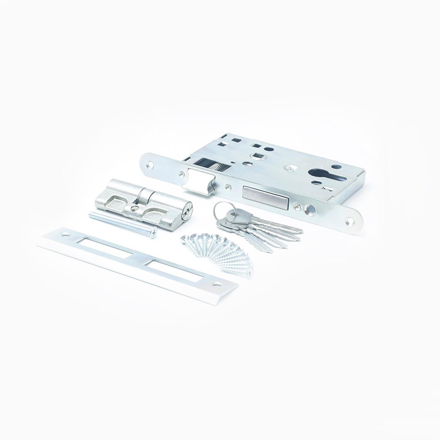 Замок врезной с ручками и цилиндровым механизмом для деревянных дверей (цвет хром) Птимаш ЗВ4-3.08