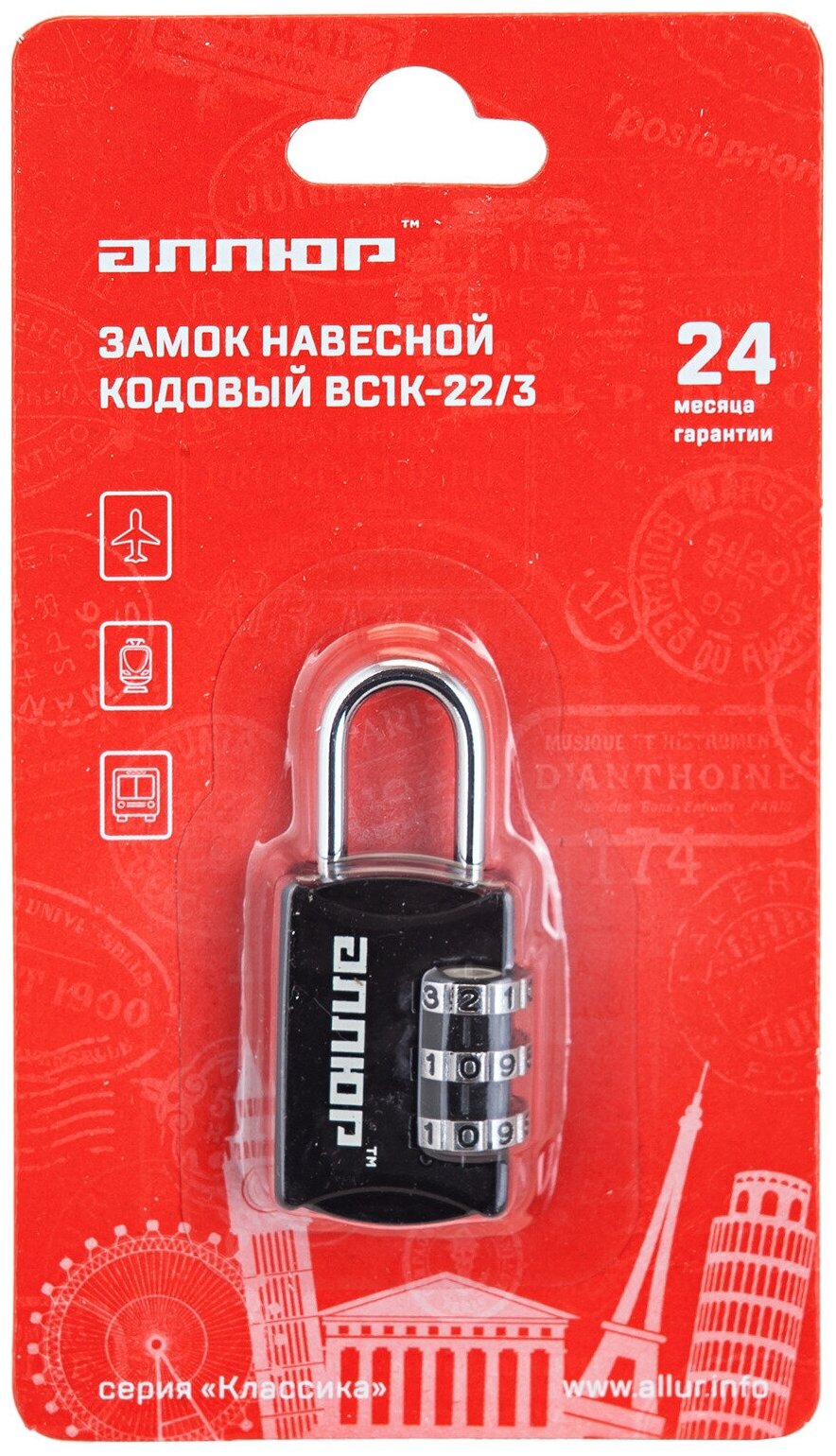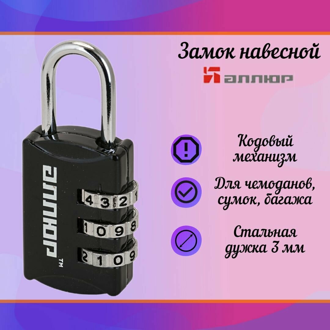 Замок навесной аллюр ВС1К-22/3 (HA816) черный кодовый d3мм д/багажа