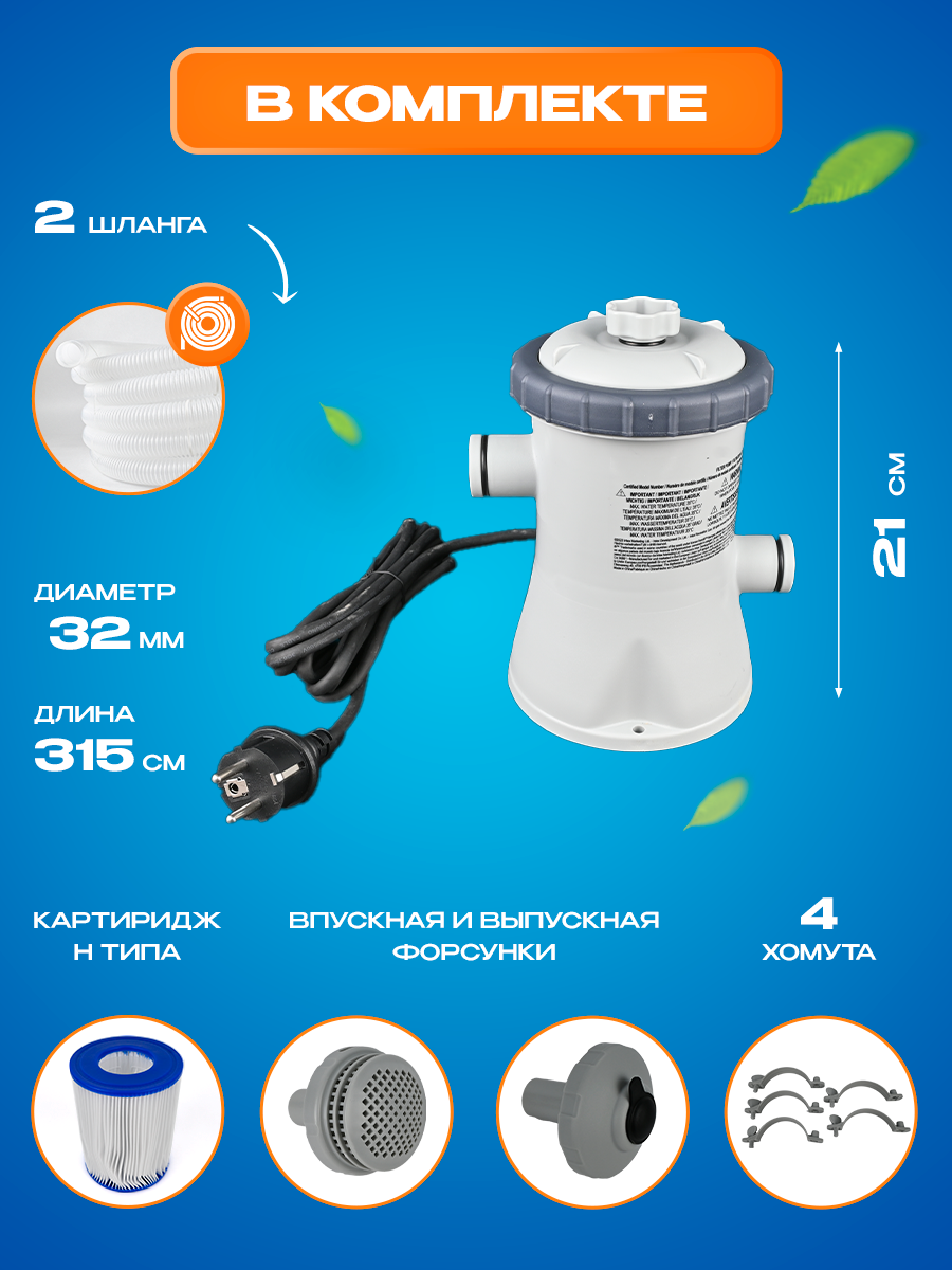 | Дополнительная информация | для надувных , каркасных и морозоустойчивых бассейнов ; рекомендуем приобрести дополнительно картридж |