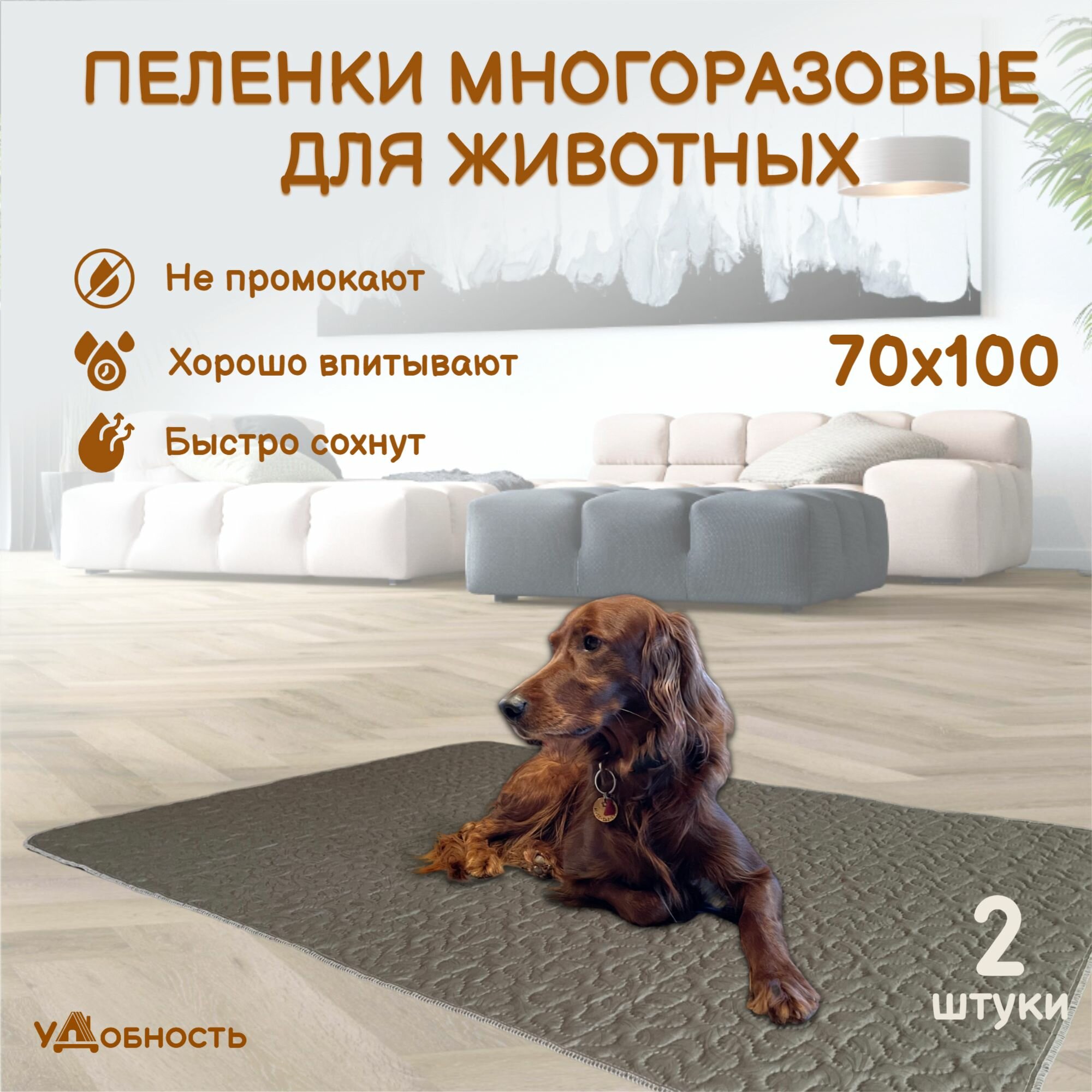 Пеленка многоразовая для собак и животных, пеленки для собак и кошек удобность 70 х 100 см, серая, 2 штуки