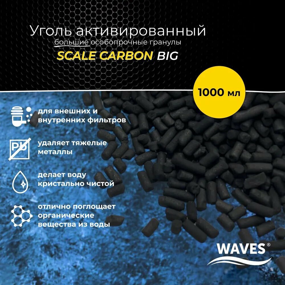 Купить Уголь активированный WAVES Scale Carbon big, 1000 мл, гранулированный, гранулы толщиной 2 мм (длина - 2-9 мм), наполнитель для аквариумного фильтра