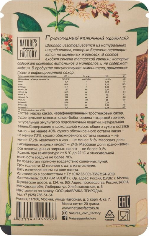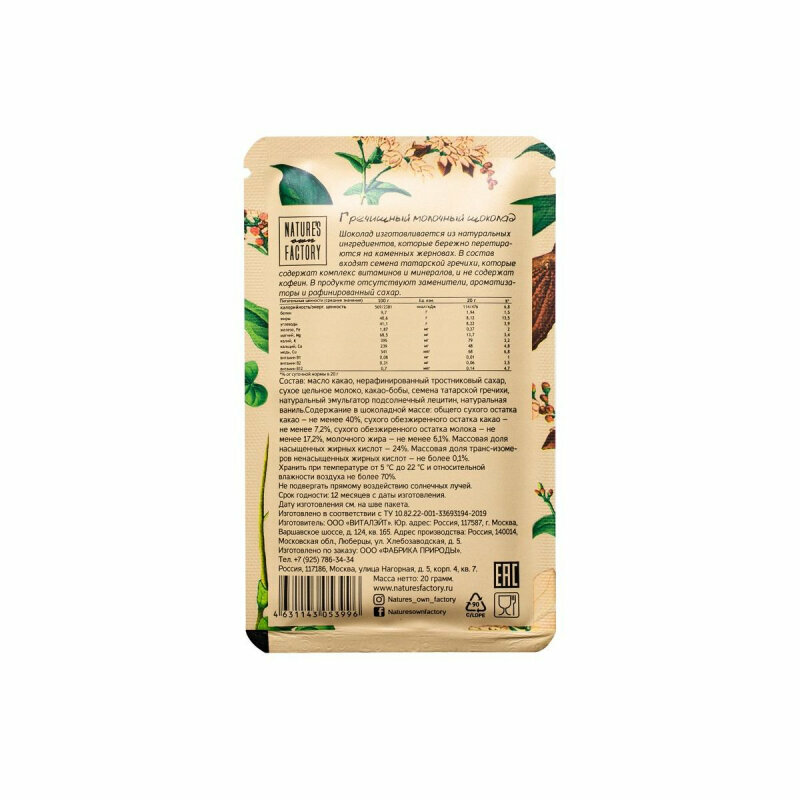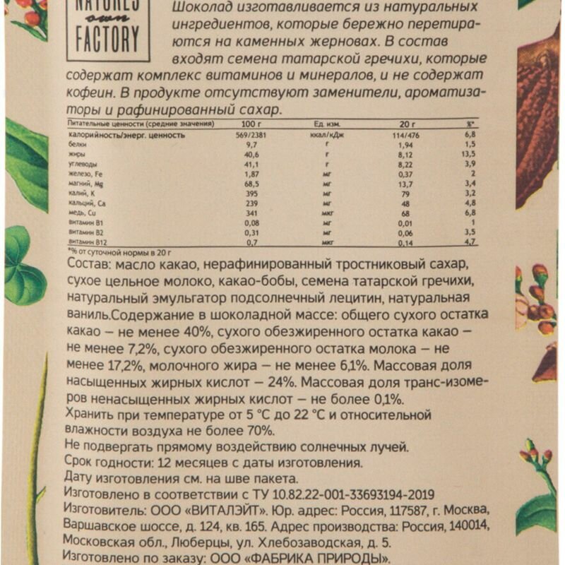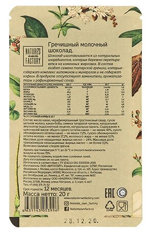 Шоколад молочный с гречишным чаем Natures own factory, 20г интересное: