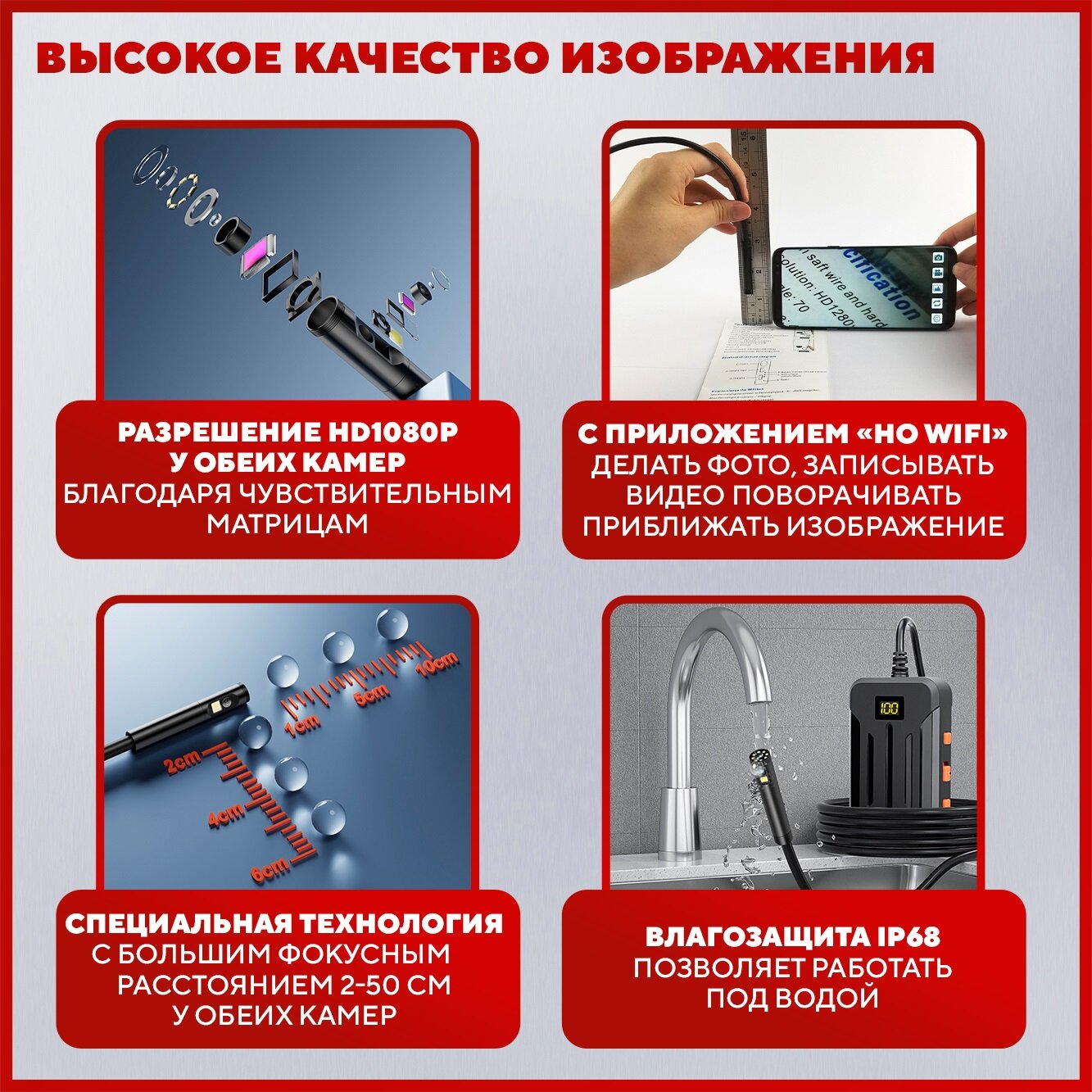 | Комплектация | эндоскоп с 2 камерами; кабель usb; 3 сменных насадки; документация |