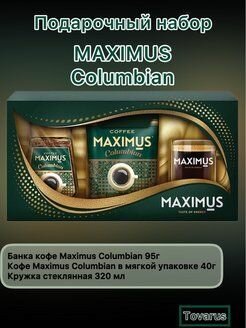 | Состав набора | Набор кофе сублимированный Columbian ТМ "Maximus". Фасовка: 95 г стеклобанка, 40 г дой-пак, кружка стеклянная 320 мл |