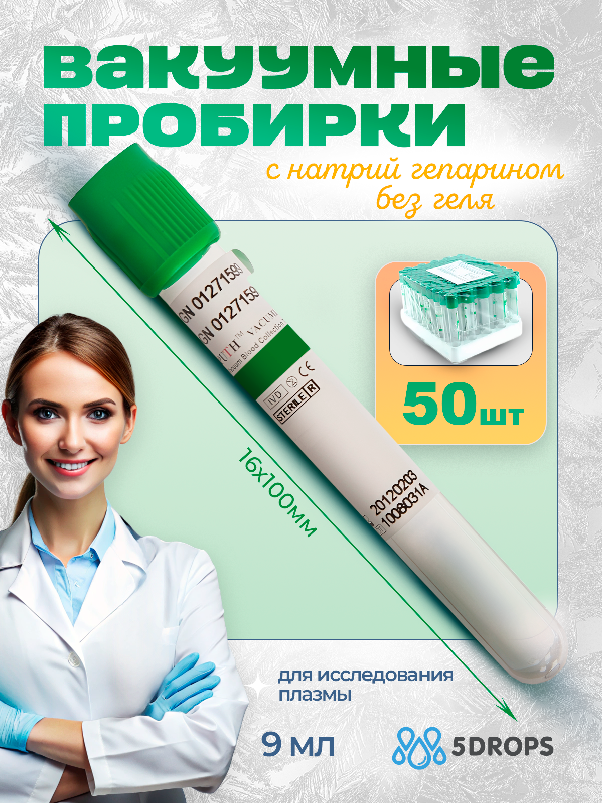 Пробирки вакуумные с натрий гепарином, 9 мл, 16х100 мм, 50 шт, пластик, для исследования плазмы