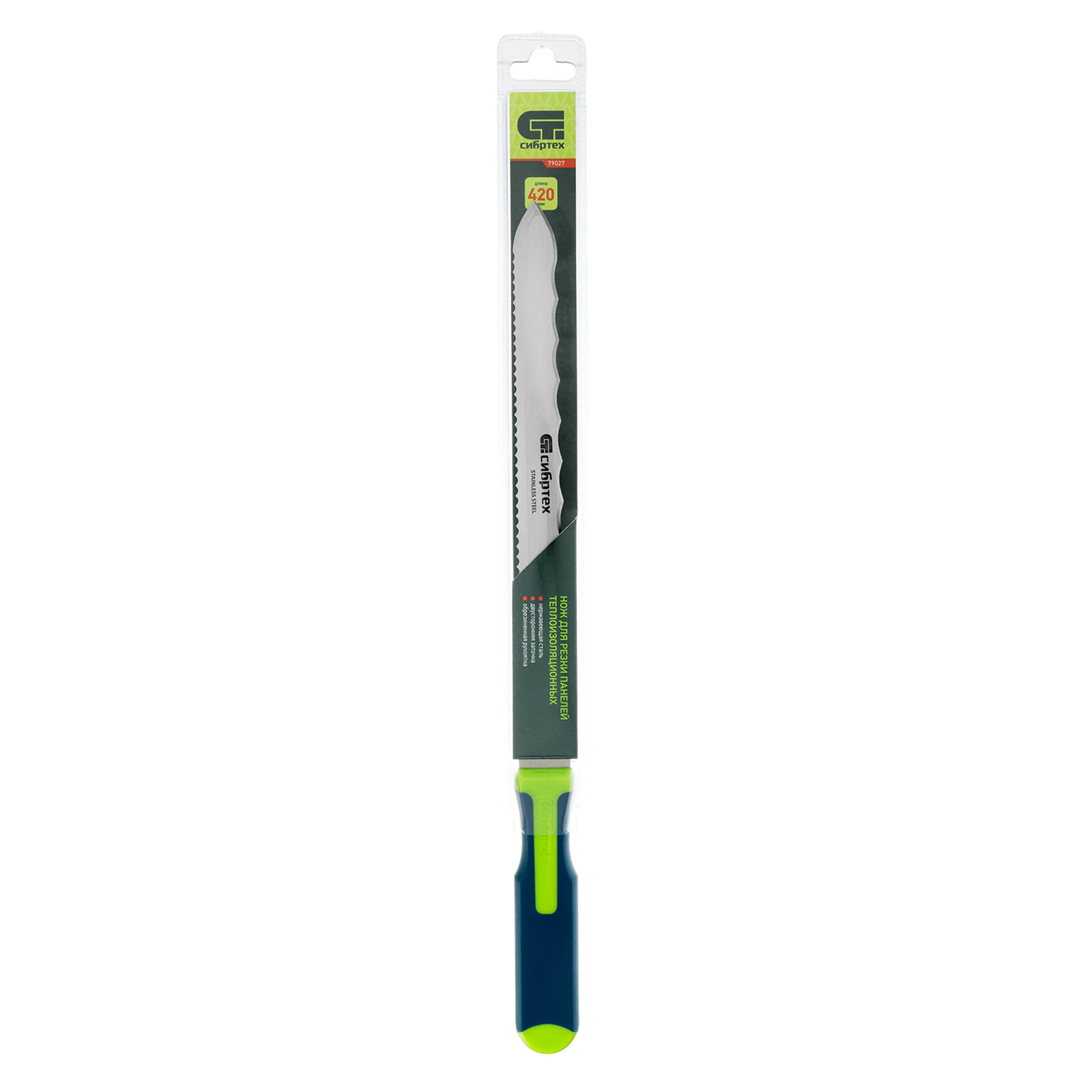 | Подробная комплектация | Нож для резки теплоизоляционных панелей, 2-стороннее лезвие, обрезиненная рукоятка, 420 мм, лезвие 280 мм Сибртех - 1 штука |