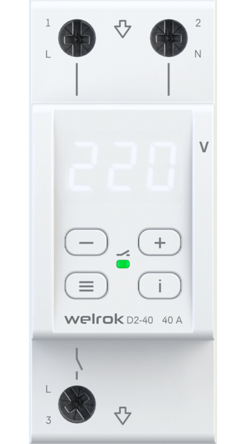 Реле контроля напряжения Welrok D2-40 red, однофазное, двухмодульное, 40А, с красной индикацией, три клеммы