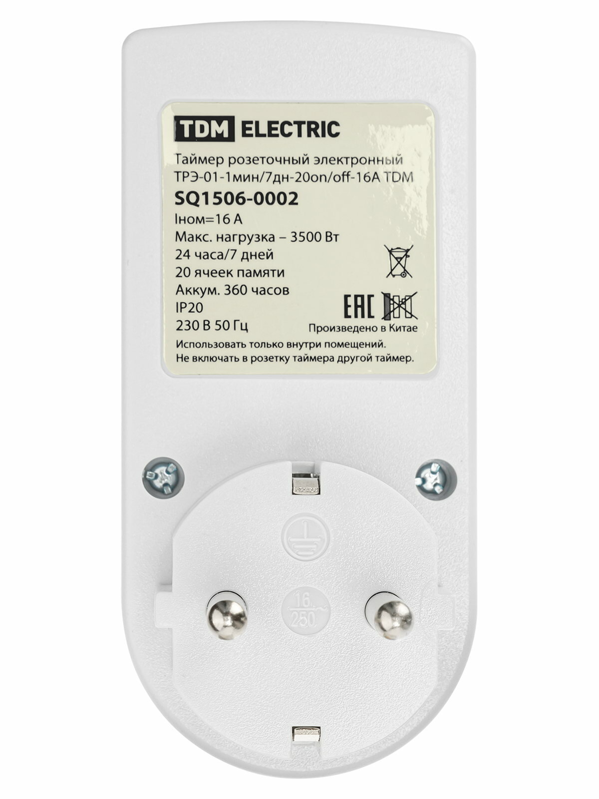 | Комплектация | Таймер эл розеточный ТРЭ-01-1мин/7дн-20on/off-16А TDM |