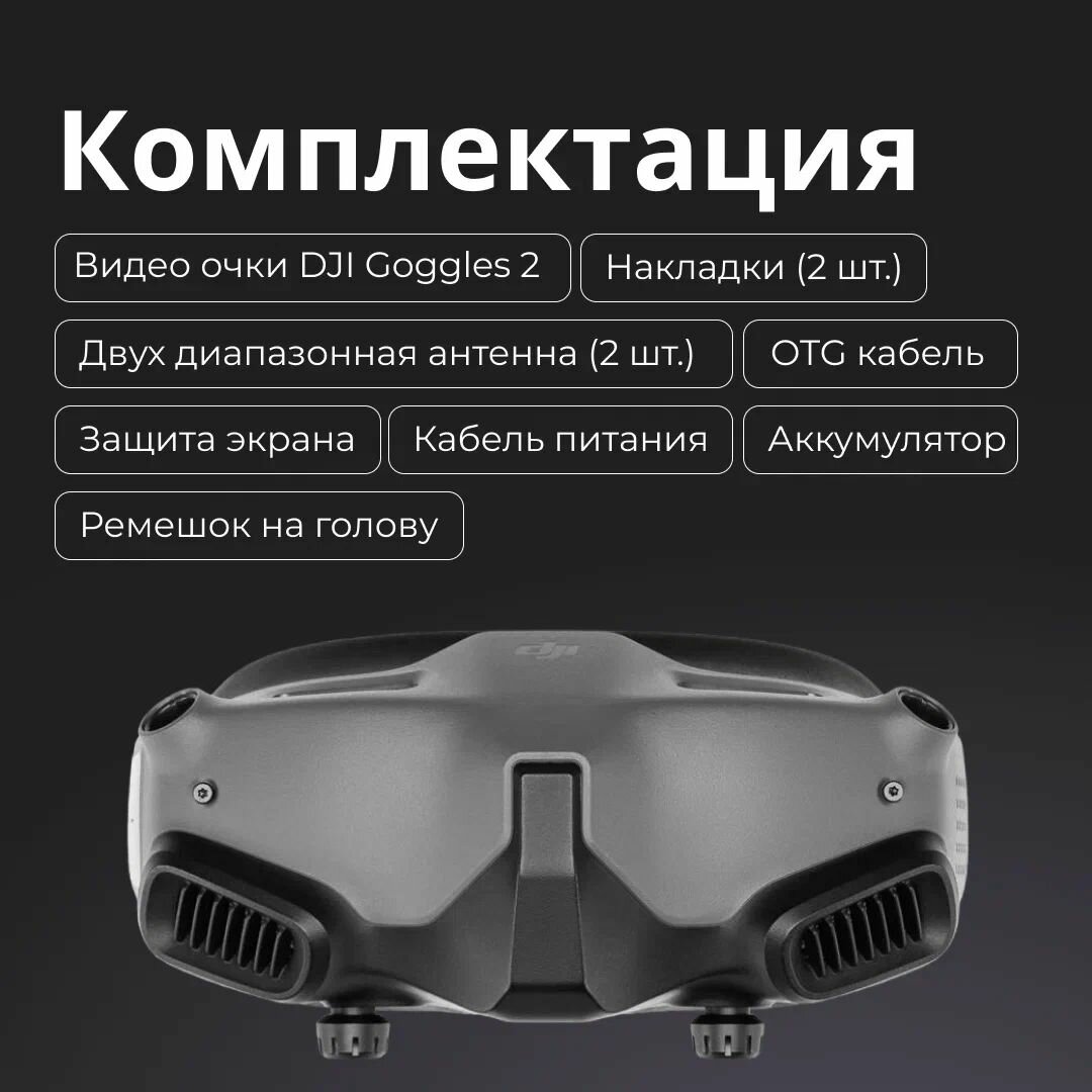 | Комплектация | видеоочки DJI Goggles 2, две двухдиапазонные антенны DJI Goggles 2, две накладки, защита экранов, кабель питания, ремешок на голову, аккумулятор, OTG кабель |