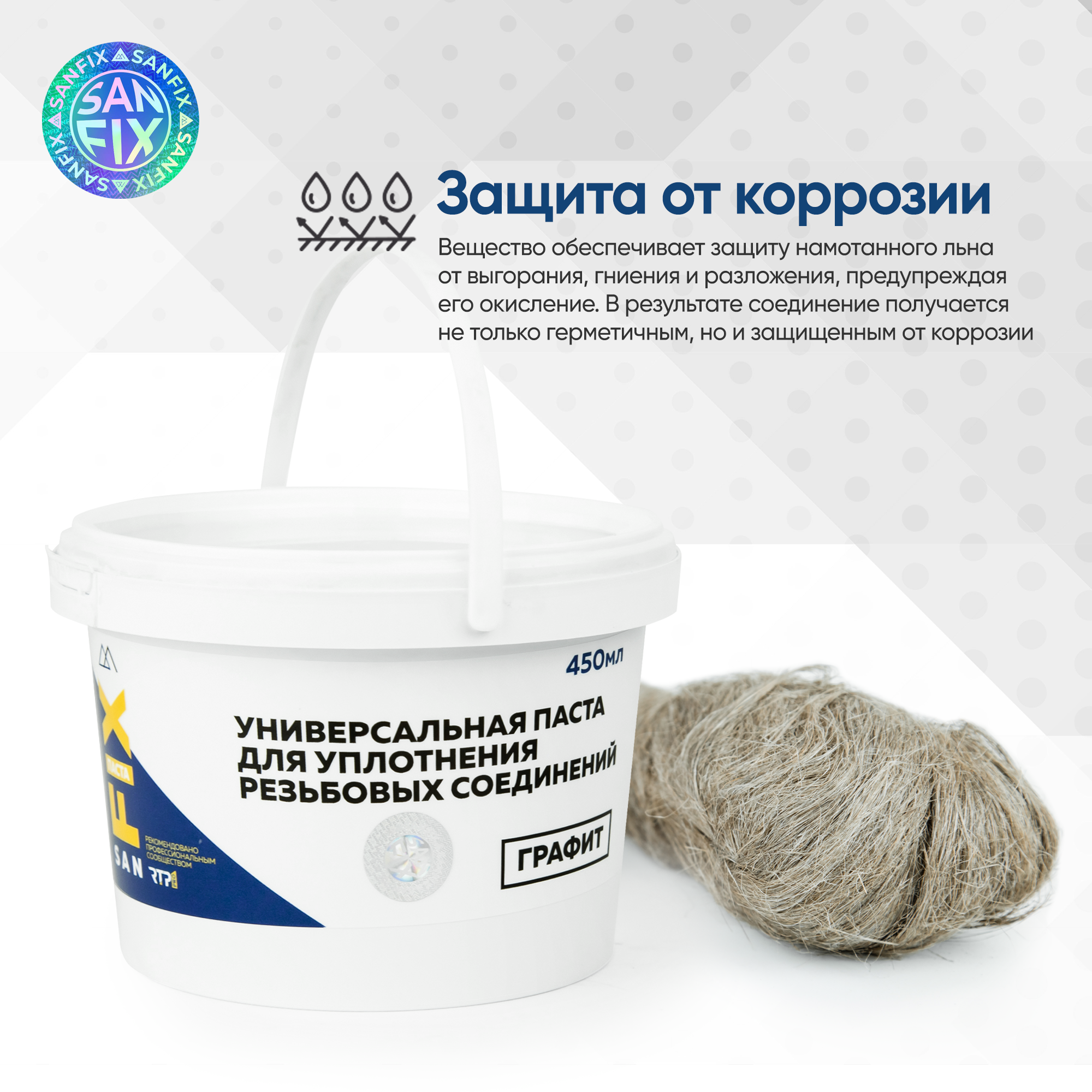 | Дополнительная информация | Паста SANFIX применяется вместе со льном или льняной нитью. Предварительно подготавливается и очищается от грязи и посторонних включений место резьбового соединения. Рекомендовано применение универсального очистителя SANFIX. Льняные волокна необходимо плотно намотать на резьбу, соблюдая равномерность намотки и направление в сторону шага. Участок должен быть покрыт по всей длине насечек. Паста наносится на лен ровным слоем, после чего собирается соединение. Лишний лен с пастой удаляются механически, попавшее на трубу или на руки вещество смывается водой. Трубопроводом можно пользоваться непосредственно после сборки. |