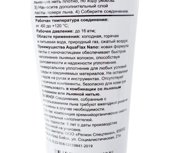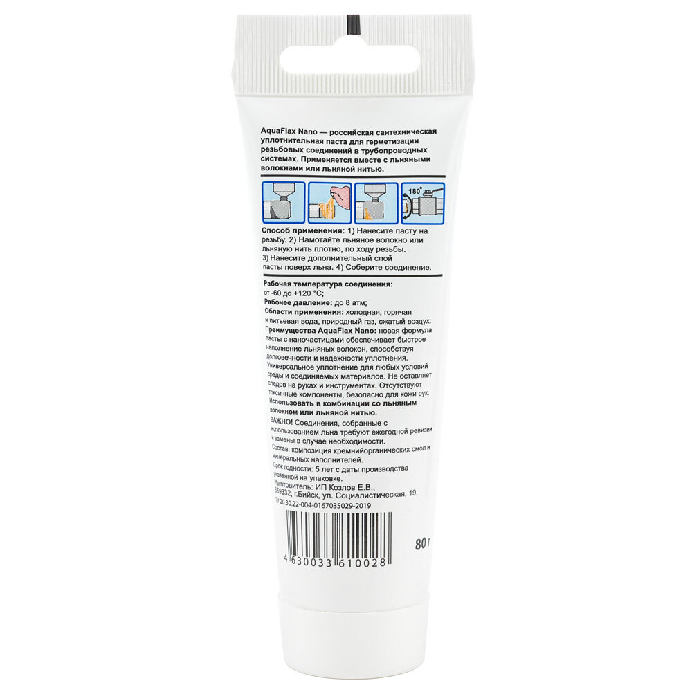 | Дополнительная информация | Паста, Aquaflax nano, Паста для герметизации резьбы, 80 г |