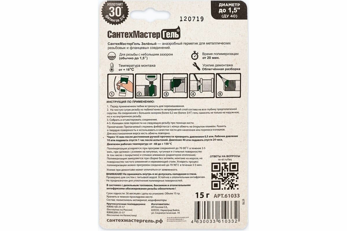 | Подробная комплектация | Клей-герметик анаэробный САНТЕХМАСТЕР ГЕЛЬ зеленый 35г |