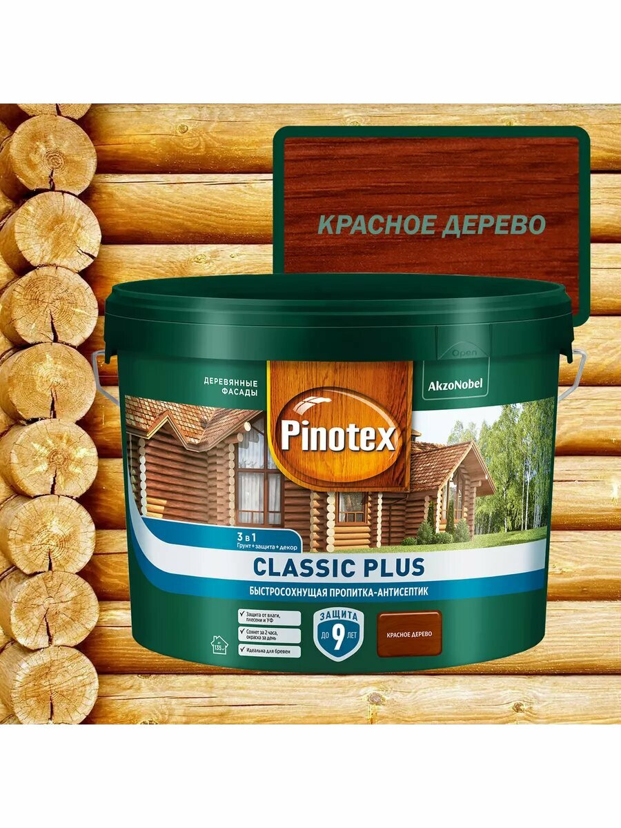 PINOTEX CLASSIC PLUS пропитка-антисептик быстросохнущая 3 в 1, красное дерево (9л)