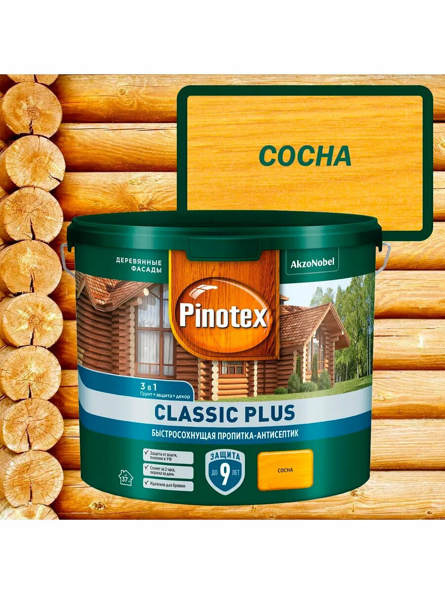 PINOTEX CLASSIC PLUS пропитка-антисептик быстросохнущая 3 в 1 ель натуральная 9л