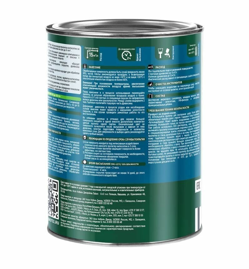 | Дополнительная информация | эксплуатацию окрашенной поверхности начинайте не ранее чем через 14 дней после окрашивания, расход на один слой: строганая древесина до 15 м²/л, пиленая древесина до 12 м²/л; упаковка товара может быть как металлическая, так и пластмассовая |