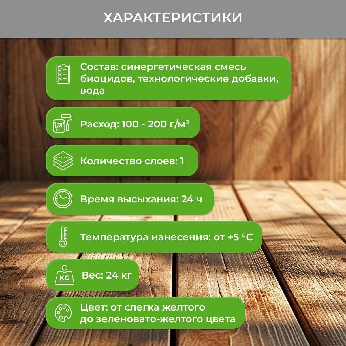 | Дополнительная информация | состав: водный раствор хлорсодержащего соединения, стабилизатор, активатор; t нанесения >+5°C; перед отбеливанием рекомендуется проводить обессмоливание древесины хвойных пород, а также пробное нанесение состава на небольшой участок древесины; после отбеливания необходима смывка с поверхности древесины остатков раствора |