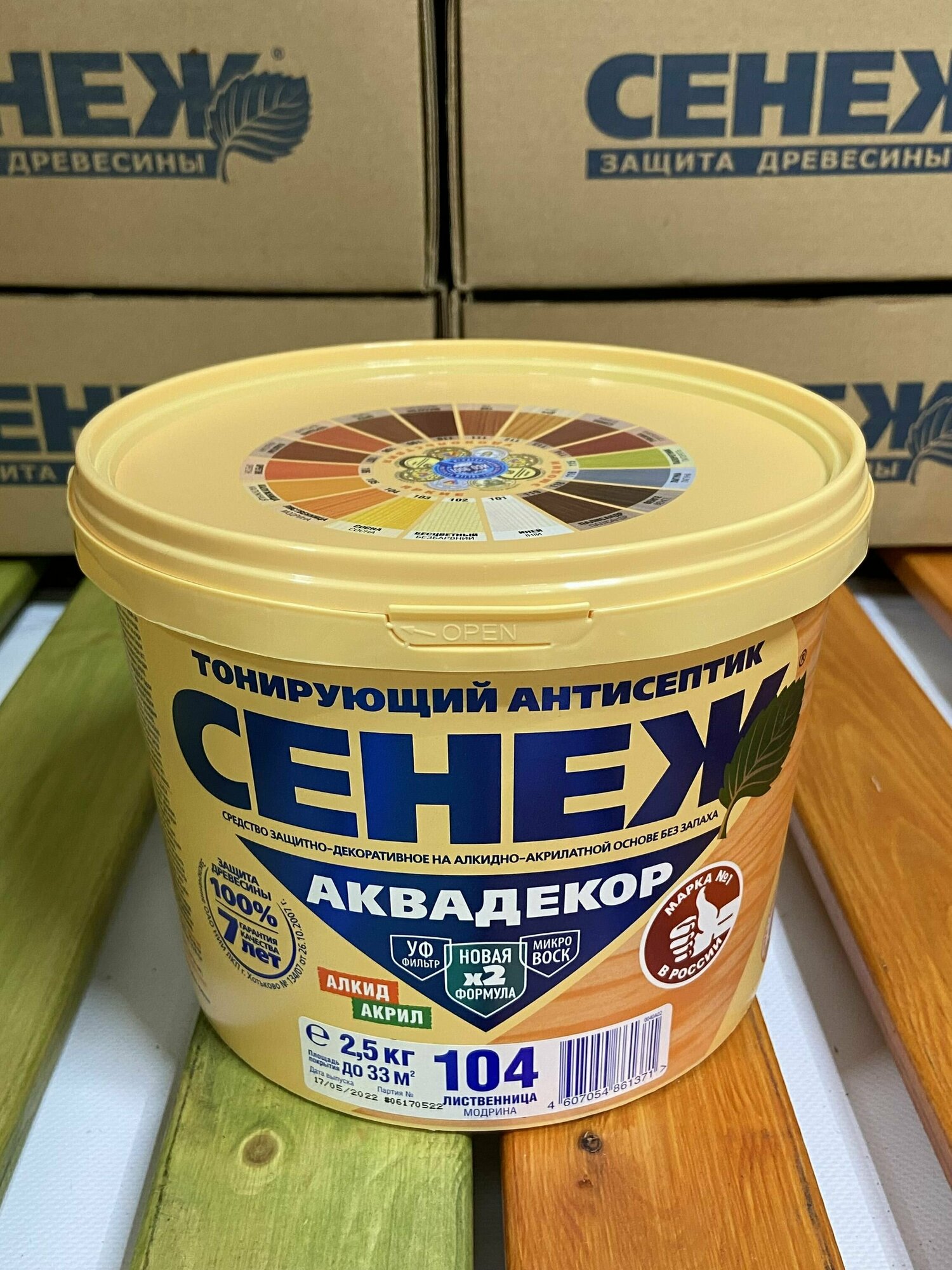 Сенеж аквадекор. Цвет 104 Лиственница. Тонирующий антисептик на алкидно-акрилатной основе с УФ фильтром и воском для долговременной защиты и отделки древесины. Ведро массой нетто 2,5 кг.