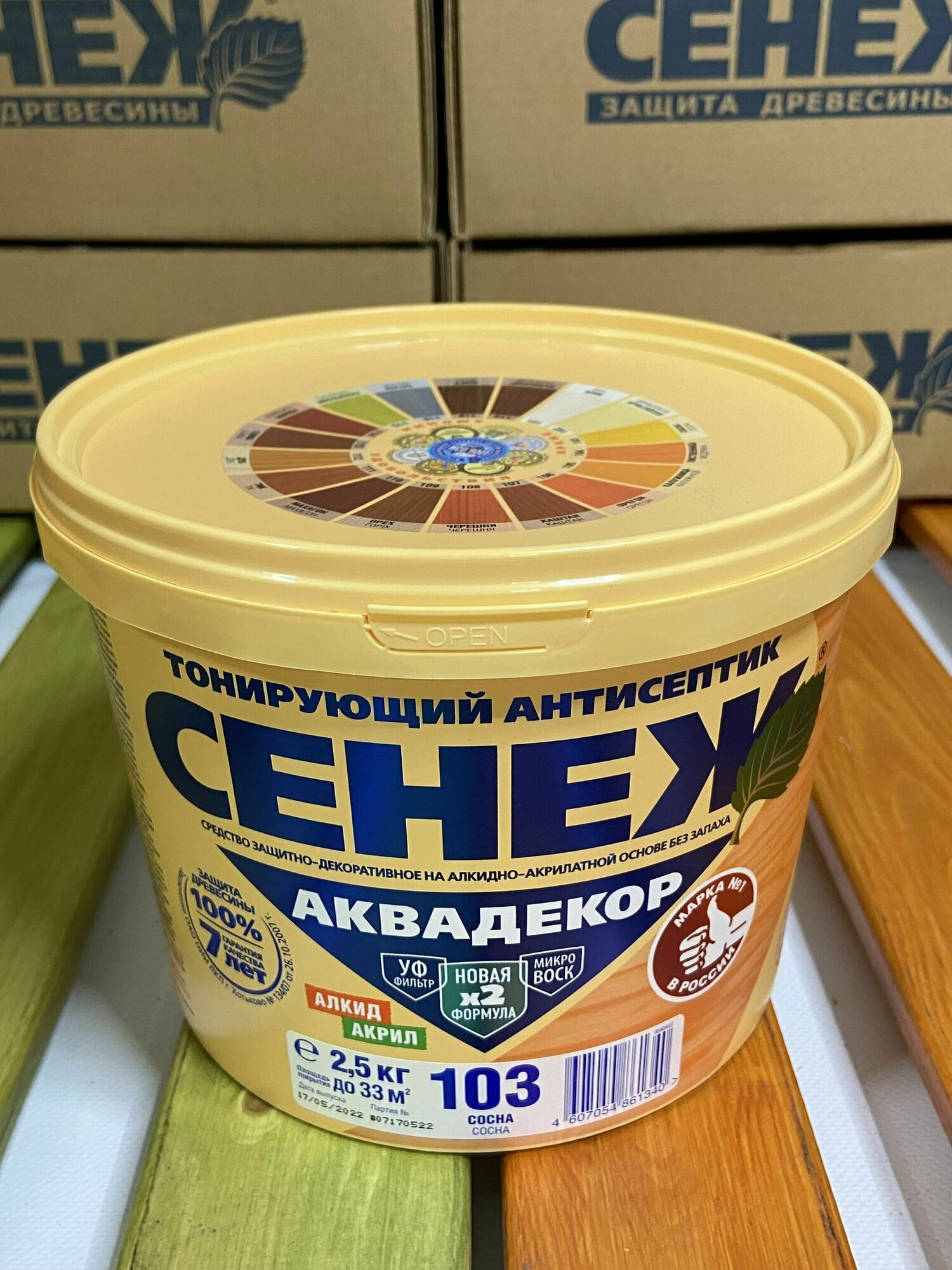 Сенеж аквадекор. Цвет 103 Сосна. Тонирующий антисептик на алкидно-акрилатной основе с УФ фильтром и воском для долговременной защиты и отделки древесины. Ведро массой нетто 2,5 кг.