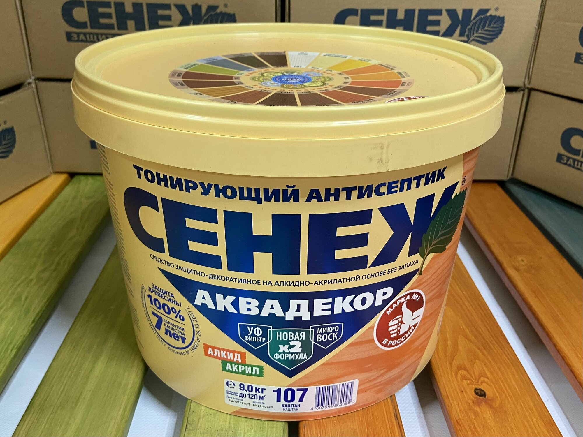 Сенеж аквадекор. Цвет 107 Каштан. Тонирующий антисептик на алкидно-акрилатной основе с УФ фильтром и воском для долговременной защиты и отделки древесины. Ведро массой нетто 0,9 кг.