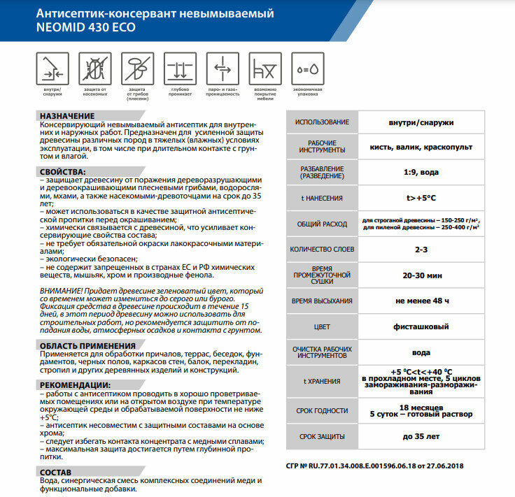 | Дополнительная информация | концентрат 1:9; расход: 150-250 г/м² — для строганной древесины, 250-400 г/м² — для пиленой древесины; хранить при температуре от +5°С до +40°С, 5 циклов замораживания-размораживания |
