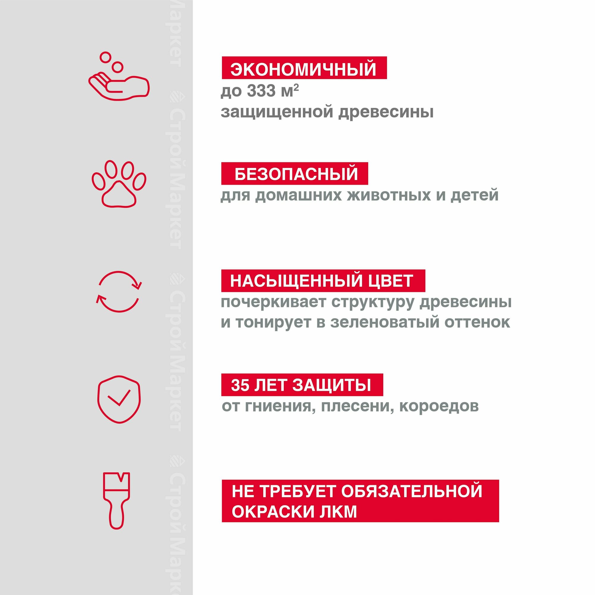 | Дополнительная информация | концентрат 1:9; расход: 150-250 г/м² — для строганной древесины, 250-400 г/м² — для пиленой древесины; хранить при температуре от +5°С до +40°С, 5 циклов замораживания-размораживания |