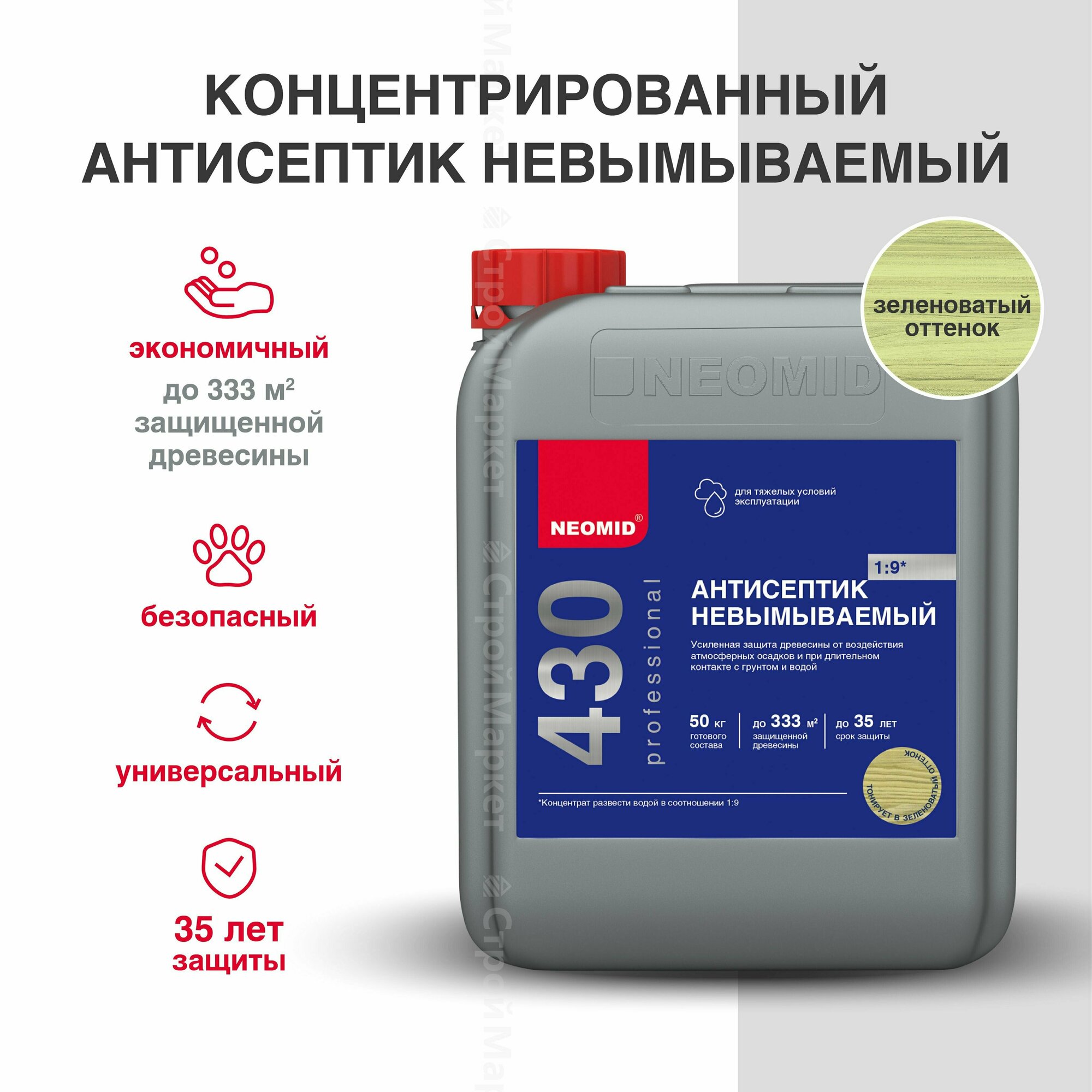 NEOMID 430 ECO антисептик невымываемый, защита до 35 лет, концентрат 1:9, зеленый (1кг)