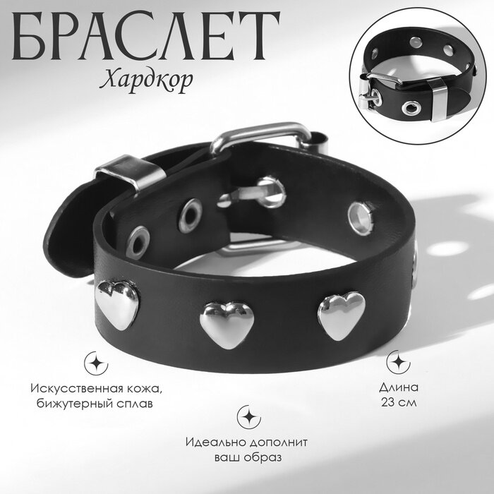 Браслет кожа "Хардкор" сердца, цвет чёрный в серебре 9669592 интересное: