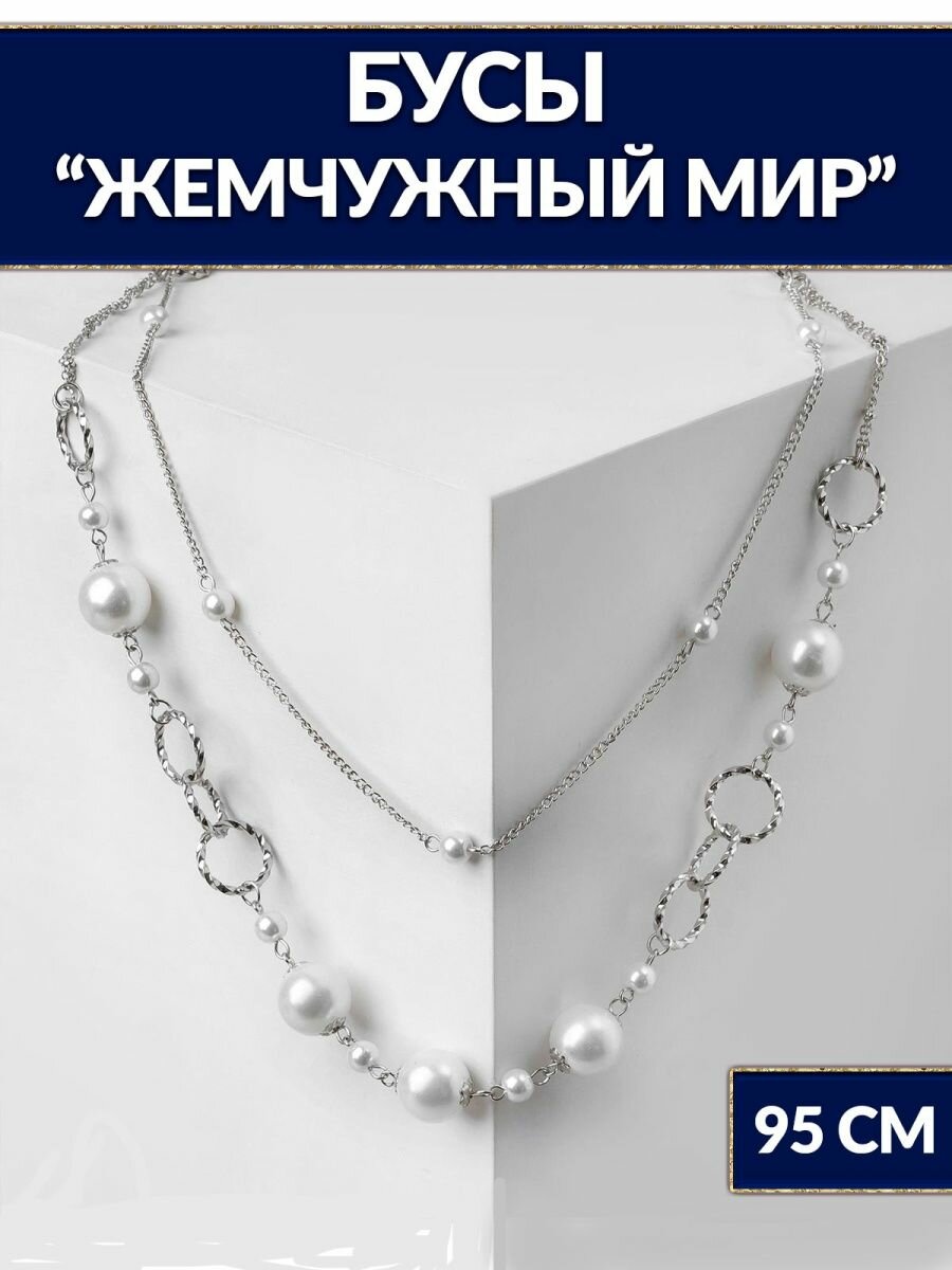 Бусы "Жемчужный мир" кольца с бусинами,цвет белый в серебре , длина 95см 6779354