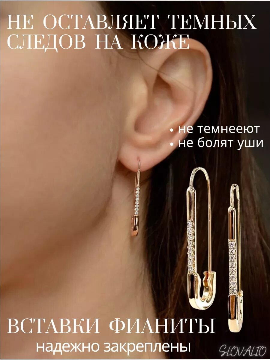 Серьги бижутерия длинные булавки, как серьги серебро, сережки булавочки позолоченные с камнями из медицинского сплава, ювелирный, родирование SLOVALIO