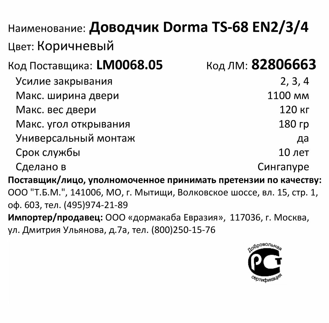 Dorma Доводчик дверной TS-68 корич. EN2-4 11335