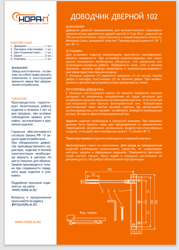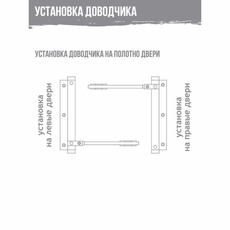 | Дополнительная информация | скорость закрывания регулируется при повороте заглушки, размещенной в нижней части корпуса доводчика |