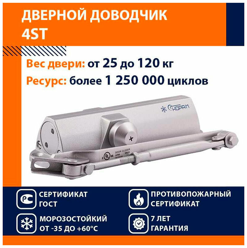 Доводчик дверной Нора-М 4ST (морозостойкий для тяжелых дверей 25-120кг) - Серебро