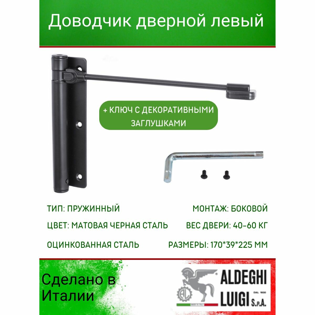 Купить Доводчик дверной ALDEGHI LUIGI SpA левый, 170х39х225 мм, матовая черная сталь, к-т: 1 шт + ключ с декоративными заглушками