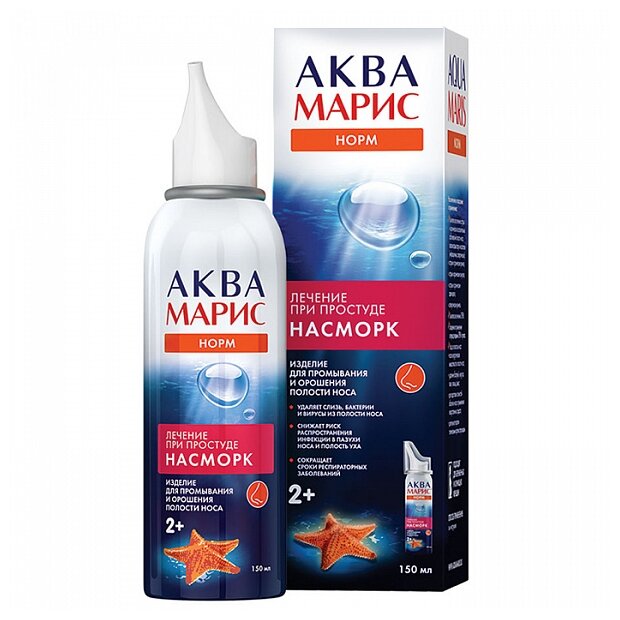 | Способ применения и дозы | Интраназально. По 1-2 впрыскиванию в каждый носовой ход несколько раз в день (2-6 раз в день) и более в случае необходимости. Средство для промывания и орошения полости носа «Аква Марис Норм. Интенсивное промывание» применяется у детей с 6-ти месяцев и взрослых. |