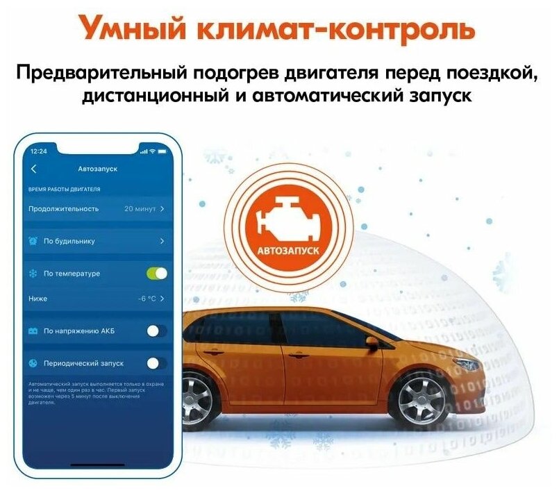 | Автозапуск двигателя | по дням недели / по заданному времени / по температуре / при низком заряде АКБ / через заданные интервалы |