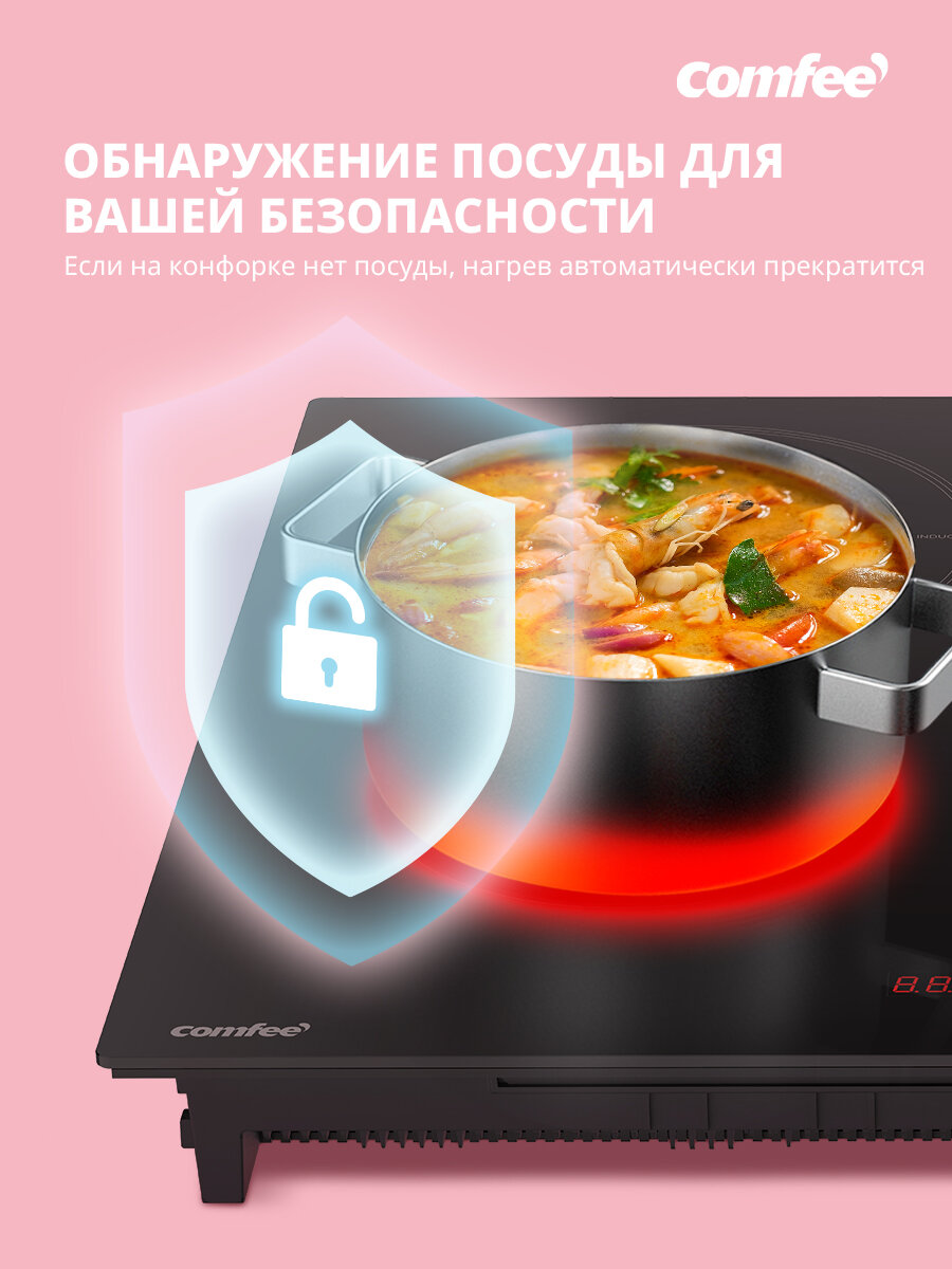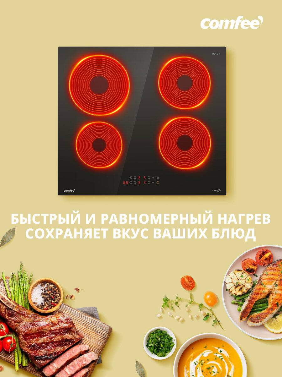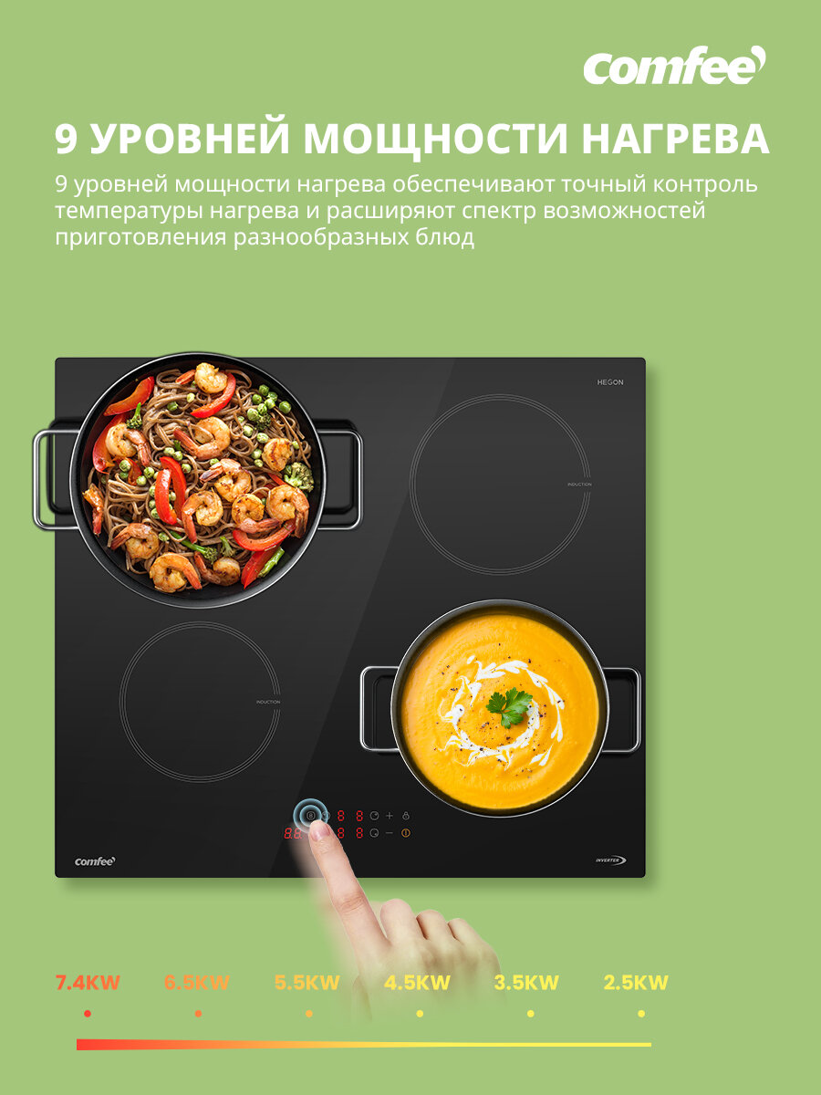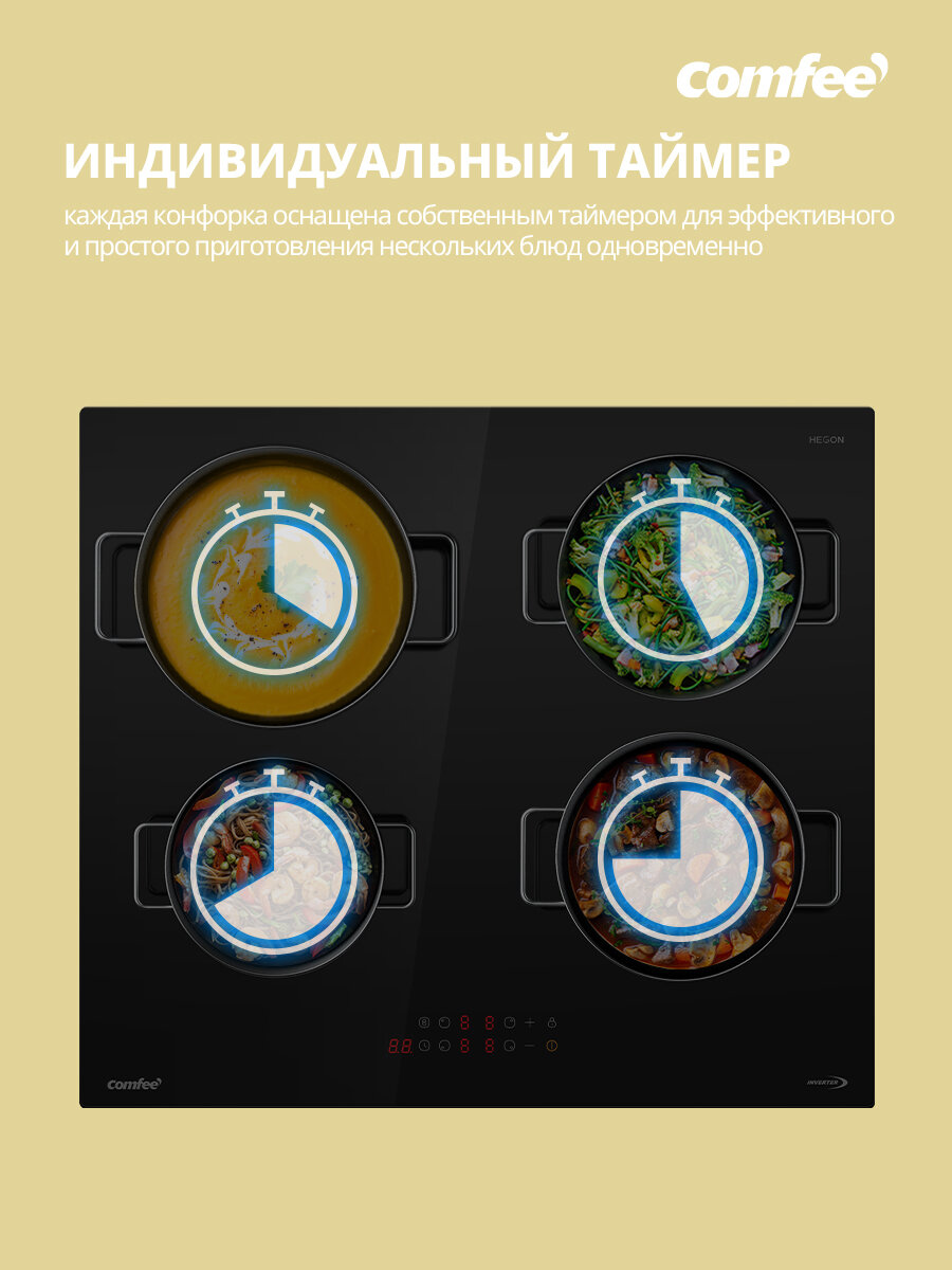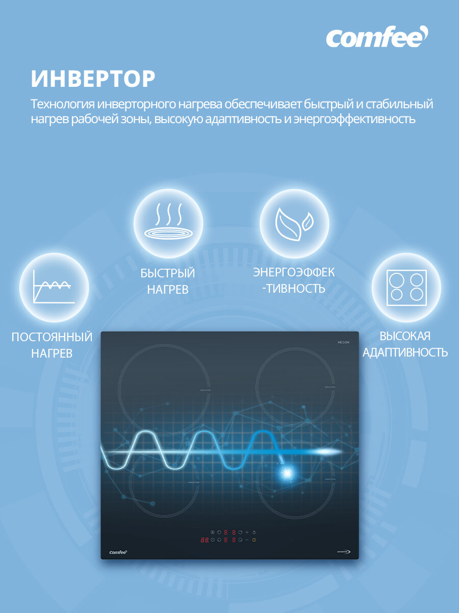 Индукционная варочная панель Comfee CIH601, инвертор, ширина 60 см, 4 конфорки, сенсорное управление, 9 уровней мощности, Boost, таймер, блокировка, автообнаружение посуды, черный интересное: