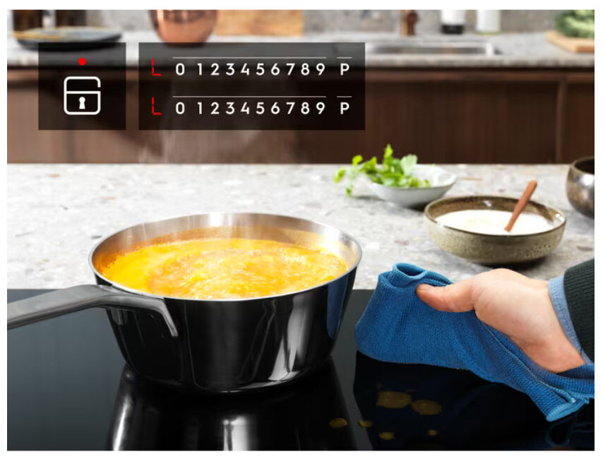| Безопасность | защитное отключение конфорок / индикатор остаточного тепла / кнопка блокировки панели |