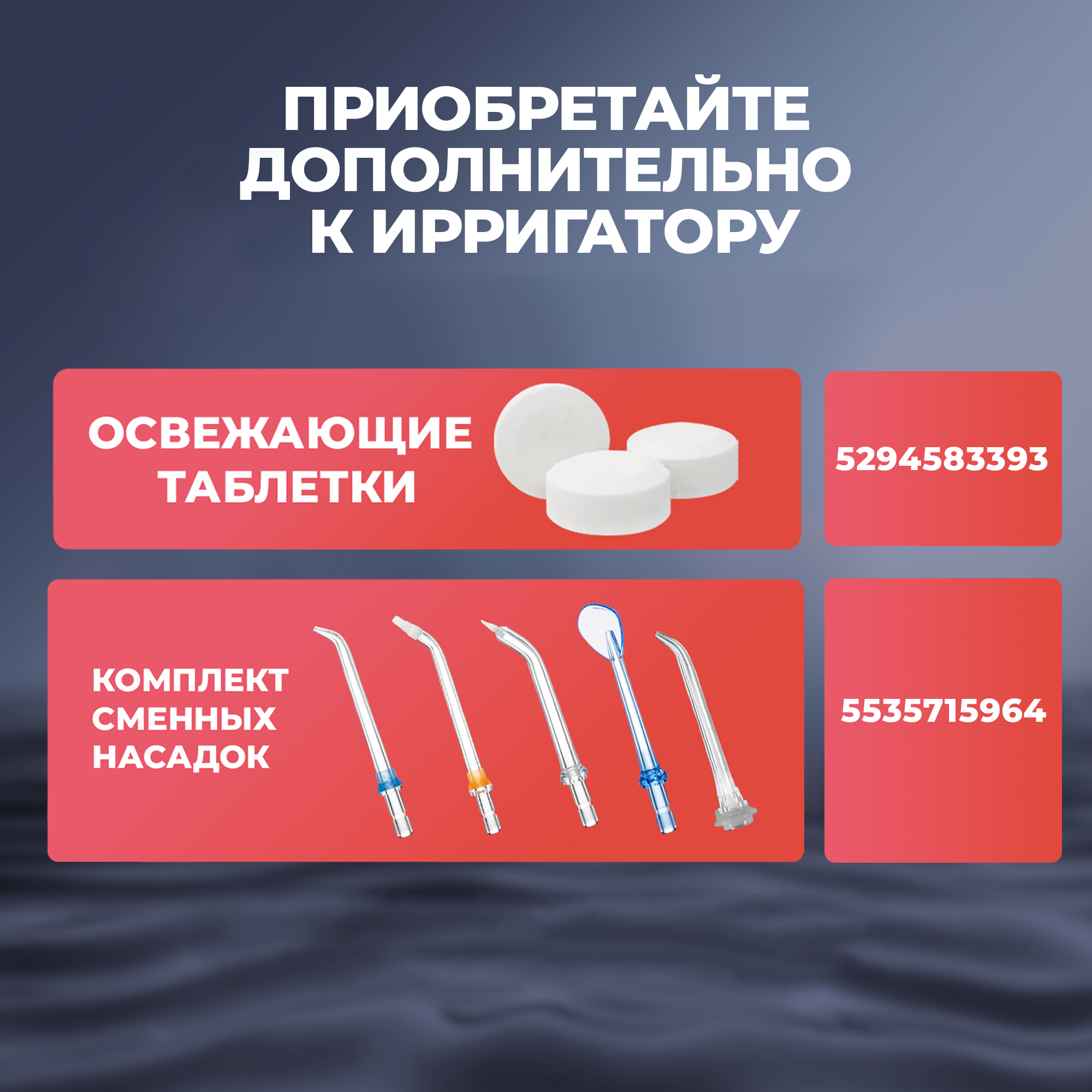 | Подробная комплектация | Ирригатор, 6 сменных насадок, руководство пользователя, кабель для зарядки, сумка для переноски, таблетки для ухода за полостью рта (30 шт.) |
