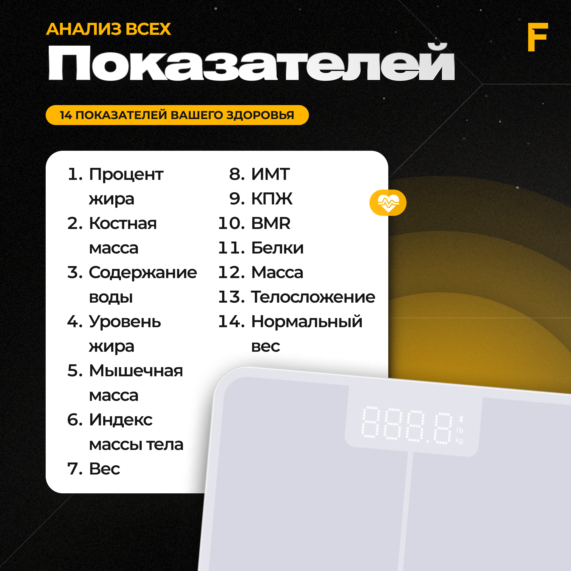| Дополнительная информация | Комплексный анализ состояния тела; Синхронизируют данные с мобильным приложением; За одно взвешивание весы измеряют 14 важных показателей; Подсветка дисплея; Цветной экран; Выдвижная панель; Высокая точность измерений; Функция автоотключения/ включения; Цветной TFT дисплей |