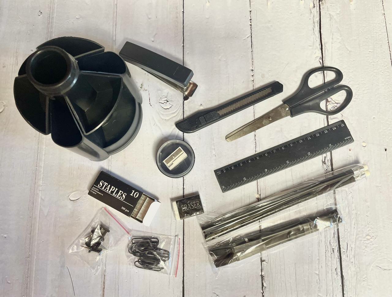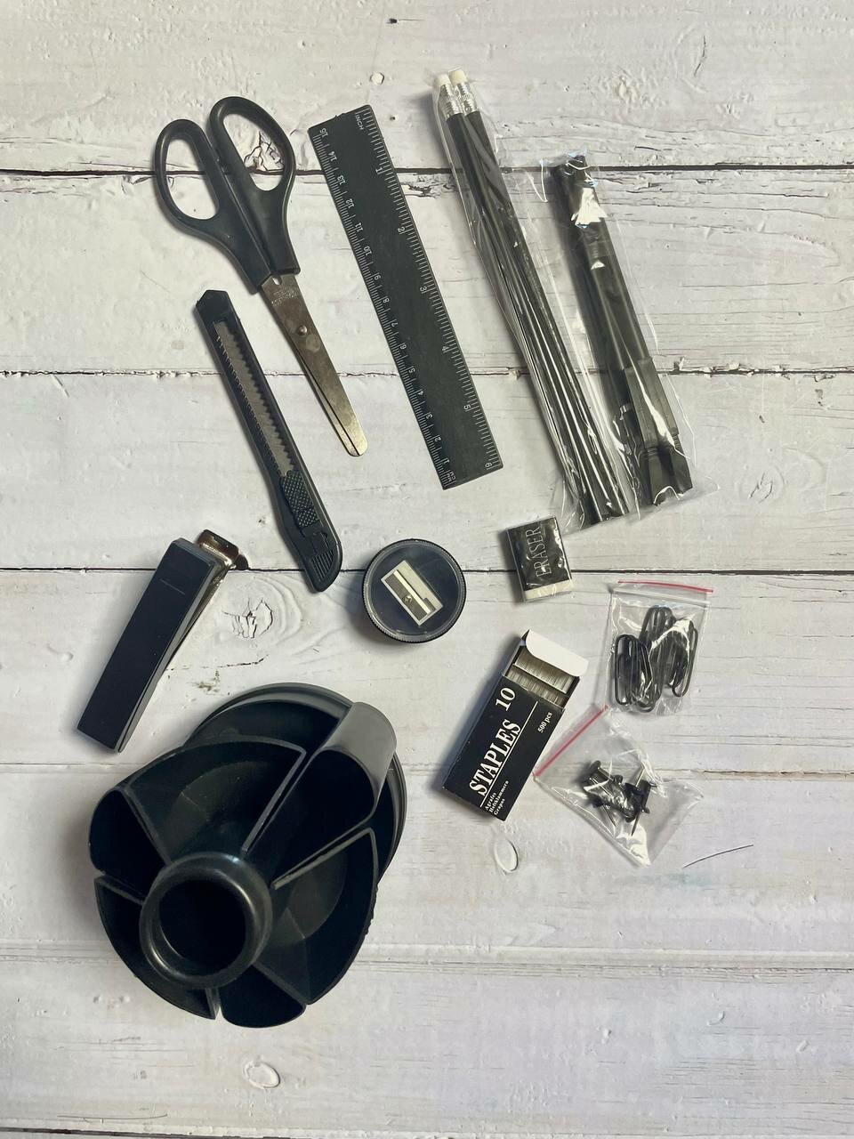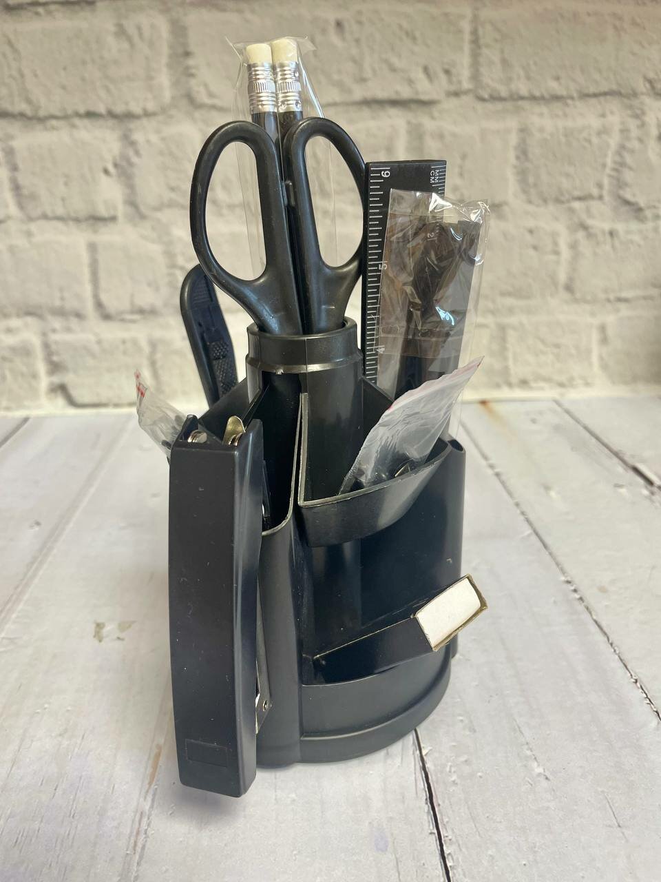 | В комплекте | подставка, два карандаша с ластиком, две ручки, канцелярский нож, точилка, ластик, ножницы, линейка, степлер № 10, силовые кнопки, скобы для степлера № 10, скрепки |