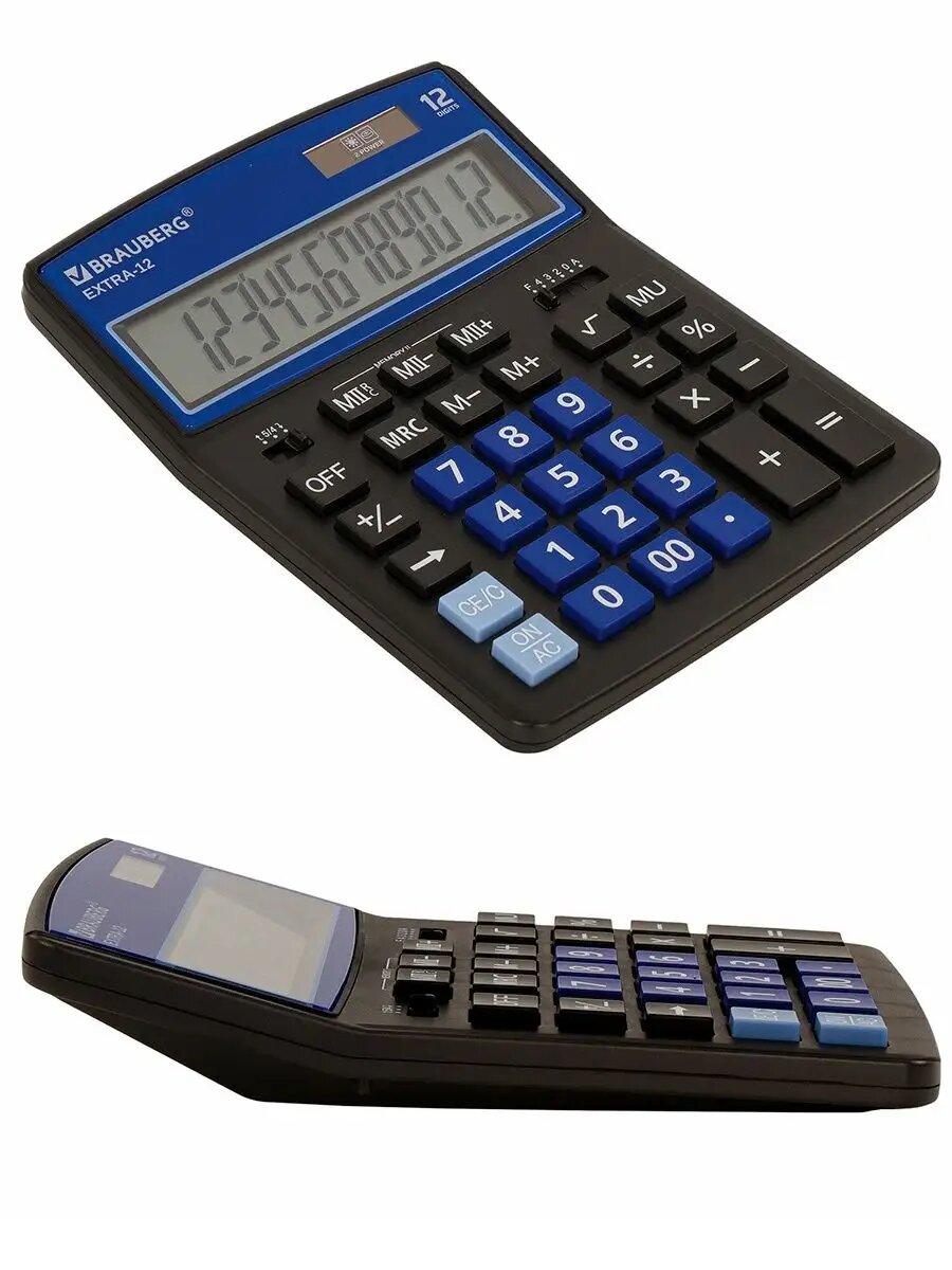Купить Калькулятор настольный BRAUBERG EXTRA-12-BKBU (206x155 мм), 12 разрядов, двойное питание, черно-синий, 250472