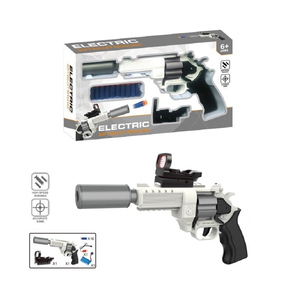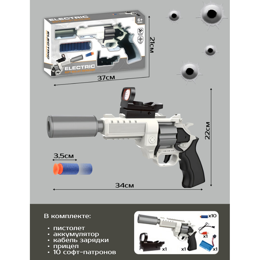 Игрушечное оружие пистолет 34 см с прицелом и глушителем с 10 мягкими пулями с присосками на аккумуляторе и батарейках, свет, звук, KYD-845/201224317