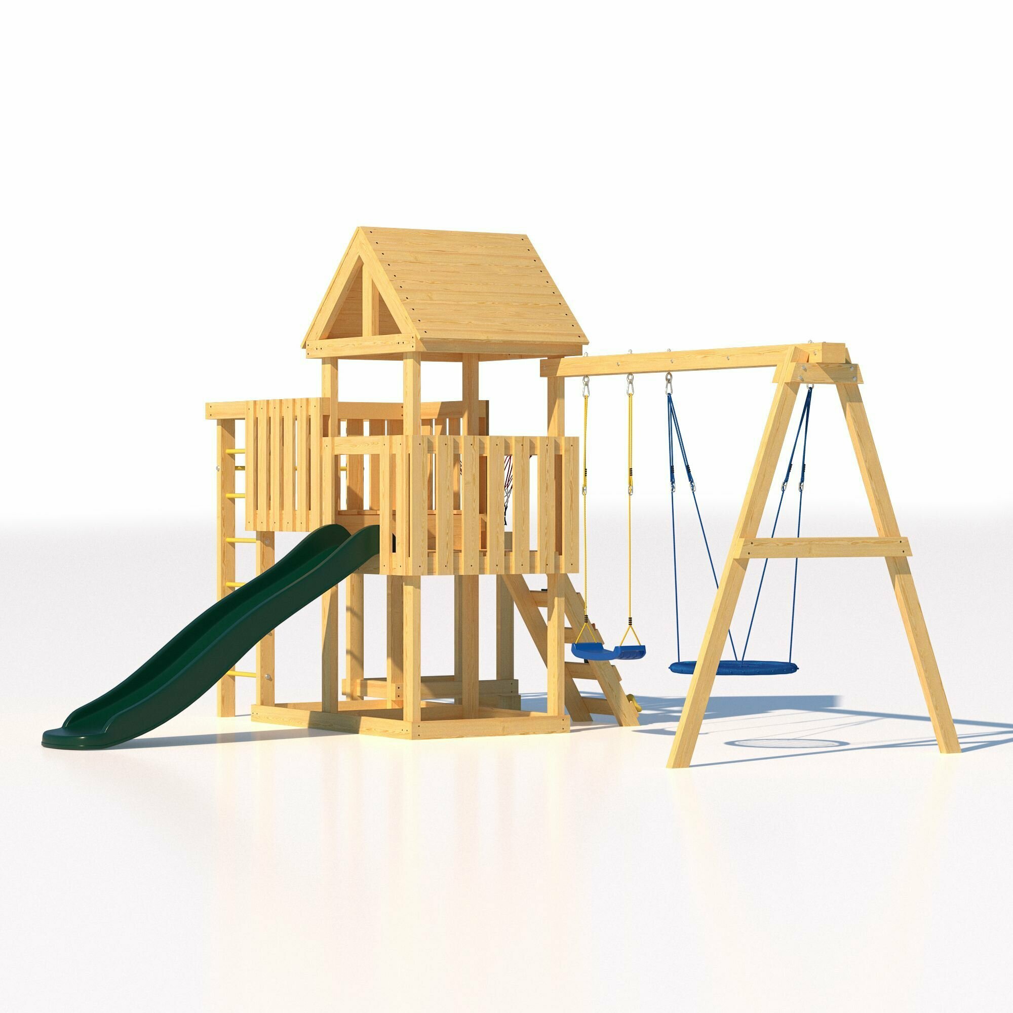 | Комплектация | Деревянный игровой домик Деревянная крыша Качельная балка Балкон Гимнастическая секция ( турник, шведская стенка, брусья, рукоход) Лестница с зацепами для скалодрома Баскетбольное кольцо с сеткой Горка пластиковая двухслойная с двойной волной 1753 мм (Бельгия) Качели без спинки - 1 шт (Бельгия) Качель гнездо 60 см - 1 шт -1 шт (Бельгия) Тонированная антисептическая пропитка на водной основе с увеличенной концентрацией защитных компонентов Шаблон для сверления отверстий Инструкция по сборке |