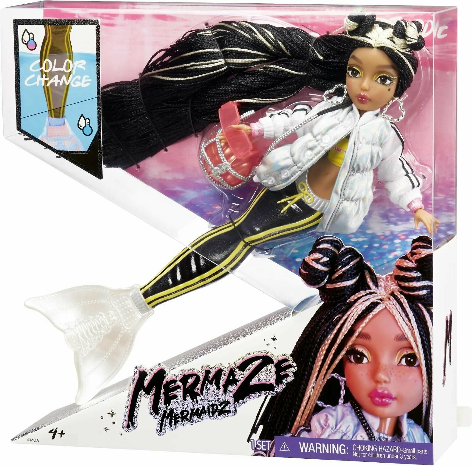 | Комплектация | Новая кукла русалка продается в прозрачной коробке, где мы сразу видим, какая кукла перед нами. На упаковке изображена главная особенность игрушки - изменение цвета хвоста русалки при контакте с водой. Черно-серебристая надпись Mermaze Mermaidz и крупное изображение куколки из игрового набора нарисованы на передней части упаковки |
