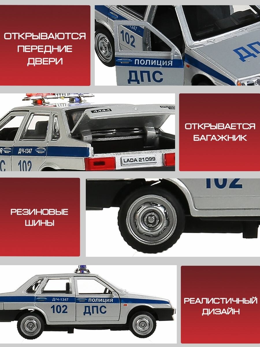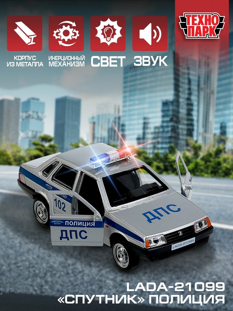 Модель машины Технопарк LADA-21099 Спутник, Полиция, серебристая, инерционная, свет, звук 21099-12SLРОL-SR