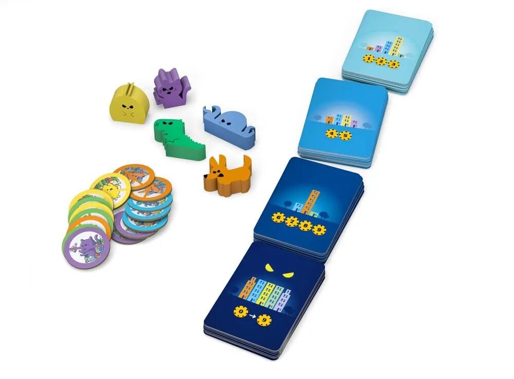 | Комплектация | В состав дополнения входят: 20 разноцветных карточек строений; 5 карт монстров; 5 фигурок монстров; 15 жетонов стоп-зилла (по 3 шт. 5 цветов); правила дополнения. |