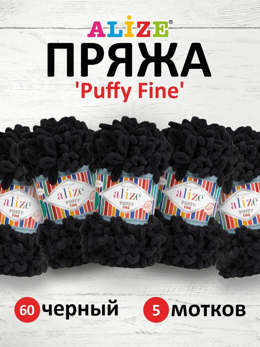 Купить Пряжа Alize Puffy fine черный (60), 100%микрополиэстер, 14.5м, 100г, 5шт