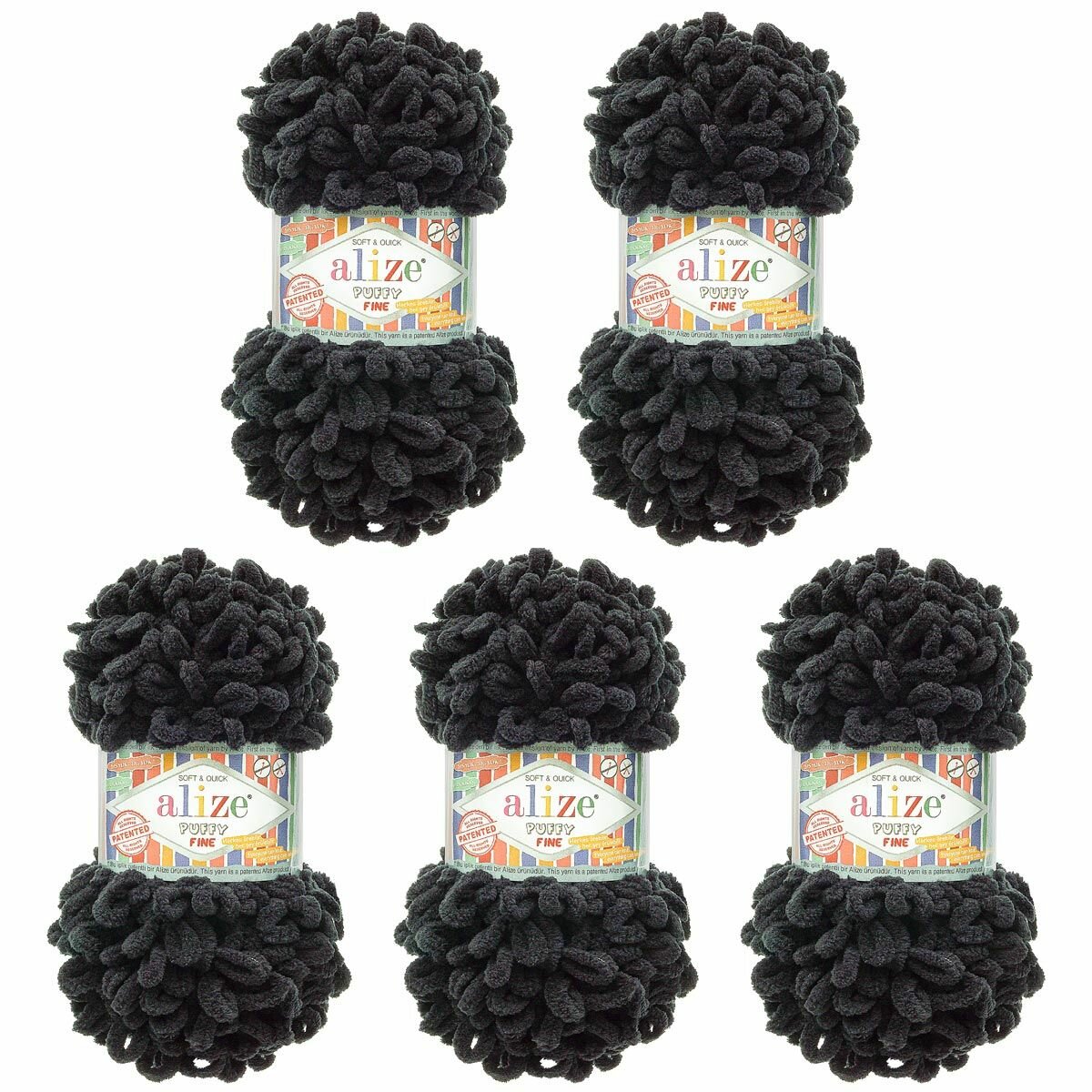 Пряжа плюшевая Alize Puffy Fine (Пуффи Файн) - 5 мотков 60 черный, для вязания рукми, маленькие петельки (2см), 100г 14м