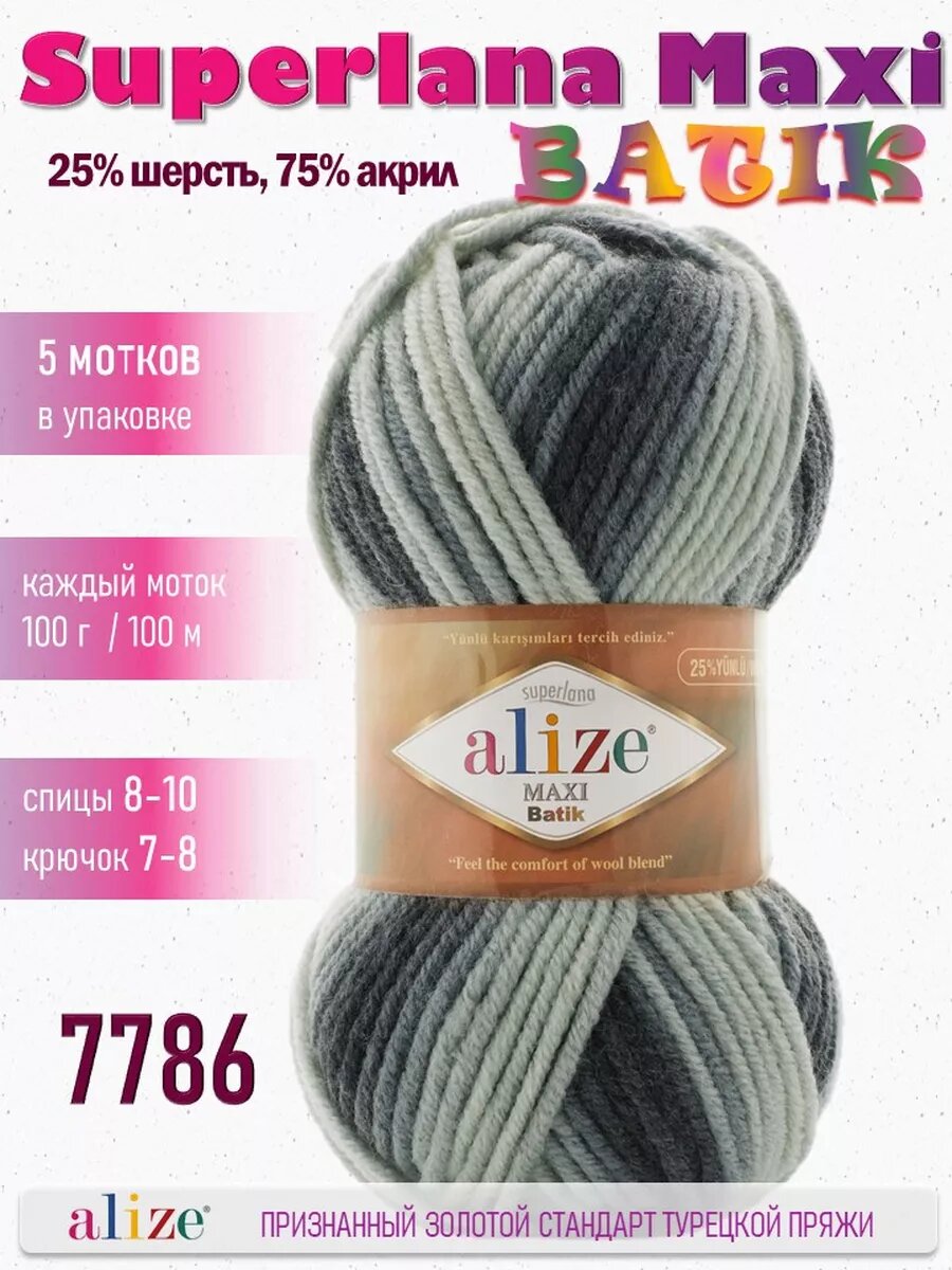 СохранитьПряжа для вязания Alize Superlana Maxi Batik (Суперлана Макси Батик) - 5 мотков 7786 серый-белый, секционная пряжа, 25% шерсть, 75% акрил, 100м/100г интересное: